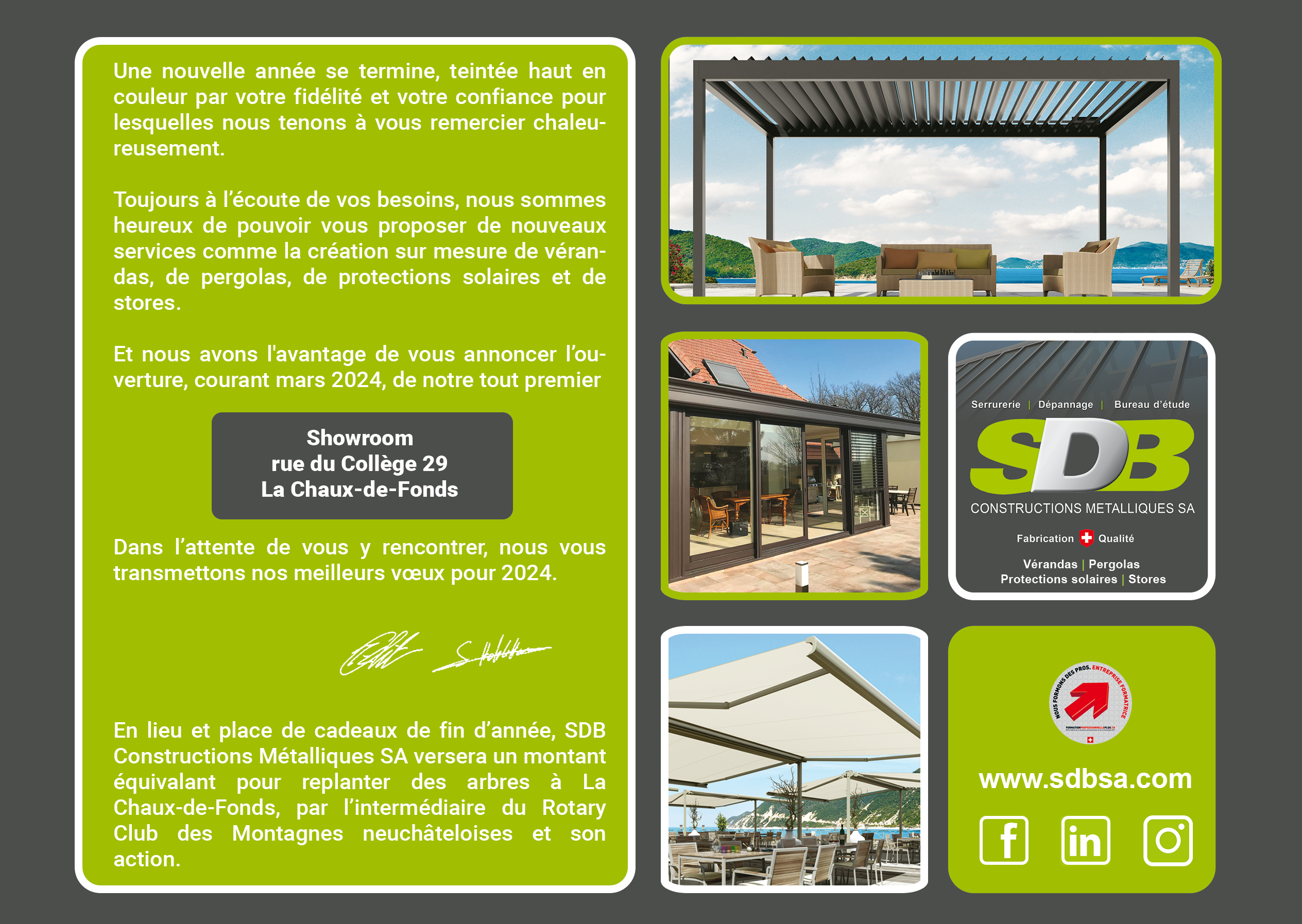 Toute l’équipe de SDB Constructions Métalliques SA vous souhaite de joyeuses fêtes de fin d’année et nous nous réjouissons de vous accueillir courant mars 2024 dans notre nouveau showroom pour votre nouvel espace de vie extérieur
