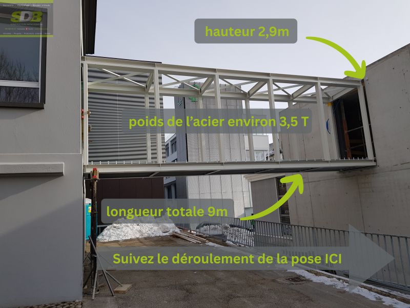 Rue Volta à La Chaux-de-Fonds, SDB Constructions Métalliques a installé une élégante passerelle en acier, accompagnée de vitrages aluminium avec impostes en façade Ouest.